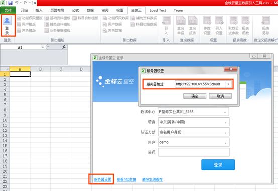 第三步:在【金蝶云】頁簽點(diǎn)擊【登陸】按鈕登陸系統(tǒng)(登陸前需要先設(shè)置好服務(wù)器地址)。