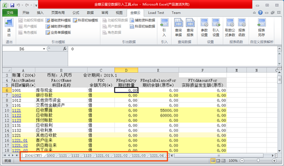 引出后科目初始數(shù)據(jù)顯示在第一個工作表,并分科目顯示核算維度初始數(shù)據(jù)。